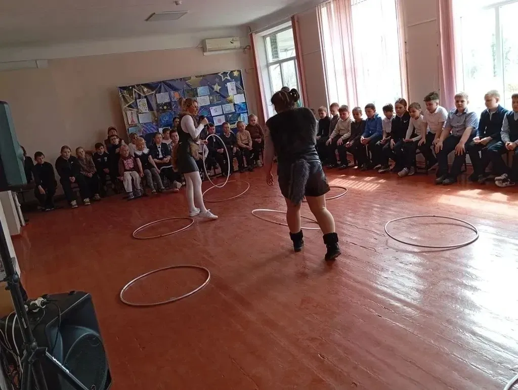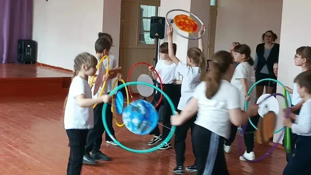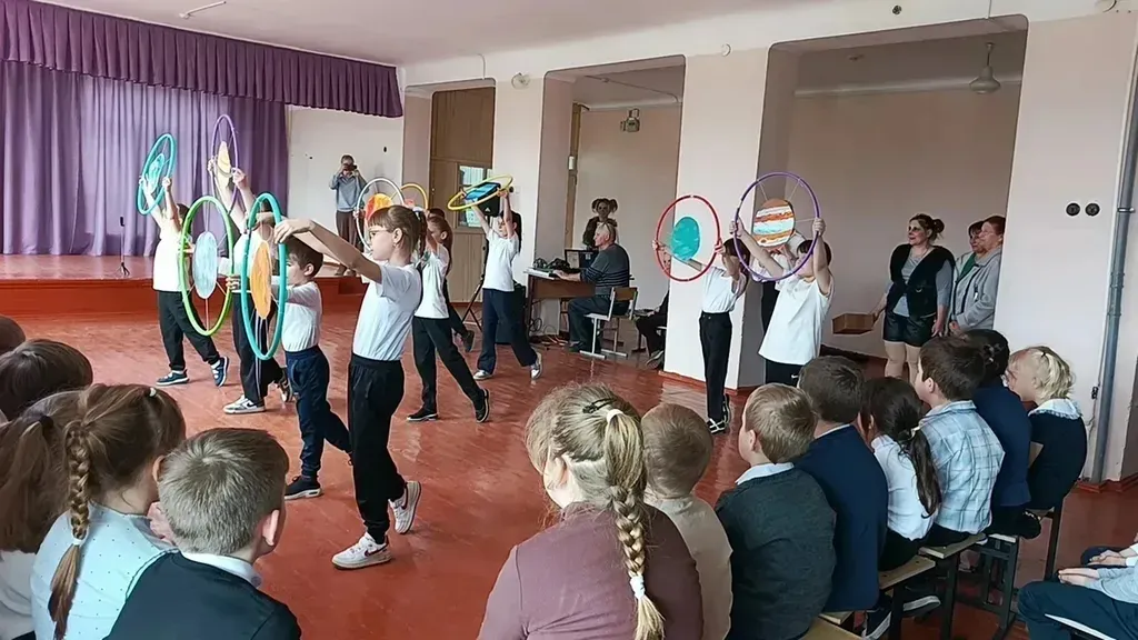 В гости к учащимся прибыли Ю. А. Гагарин и неразлучные космические подруги — Белка и Стрелка. Школьники активно включились в программу: соревновались в играх, отвечали на вопросы викторин и подпевали главным героям песни «Я — Земля» и «Земля в иллюминаторе». Учащиеся второго класса подготовили танцевальный номер «Парад планет».