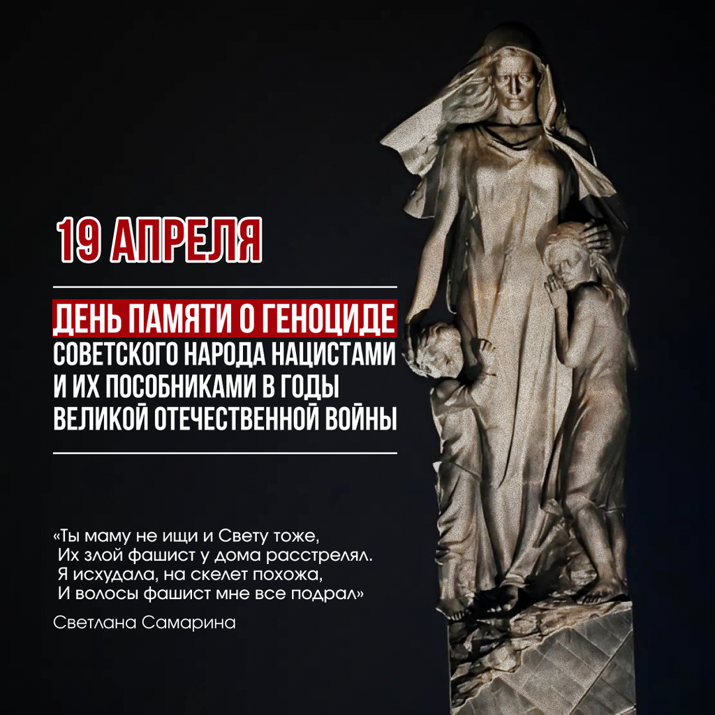 19 апреля — особая дата в российском календаре. Она установлена Федеральным законом от 29 декабря 2025 года № 523 как День памяти жертв геноцида советского народа, совершённого нацистами и их пособниками в период Великой Отечественной войны 1941–1945 годов. Выбор даты связан с тем, что 19 апреля 1943 года был издан Указ Президиума Верховного Совета СССР № 39. Этот документ впервые официально зафиксировал факты целенаправленной политики нацистов по уничтожению мирного населения на оккупированных территориях и стал правовой основой для расследования преступлений.