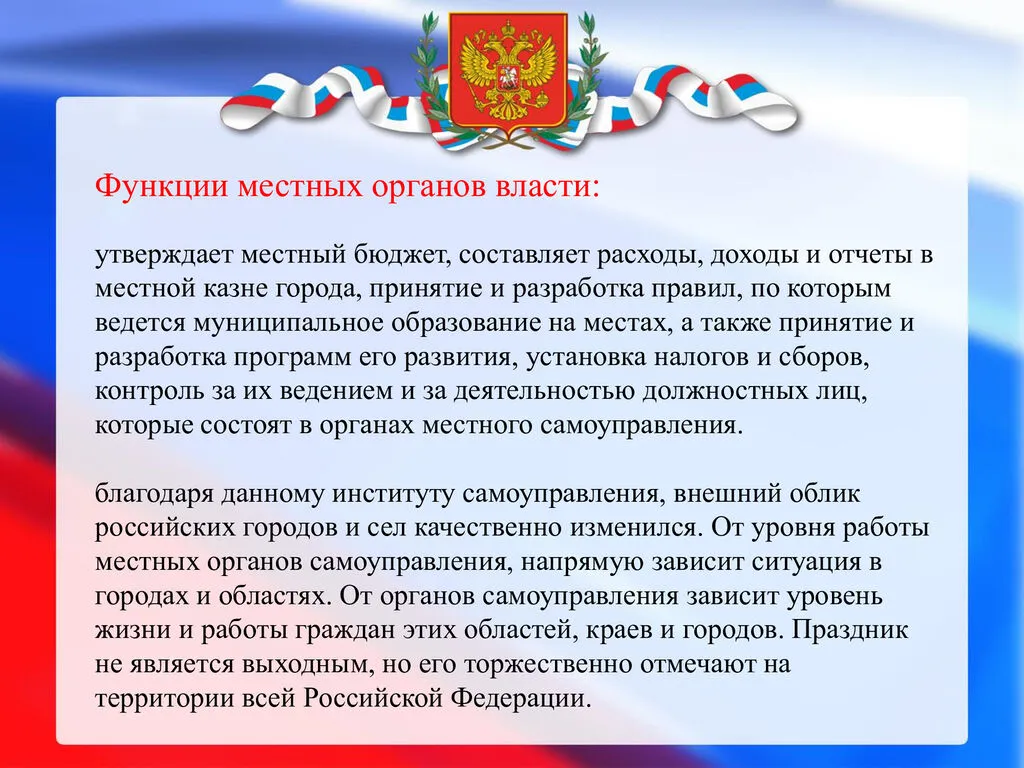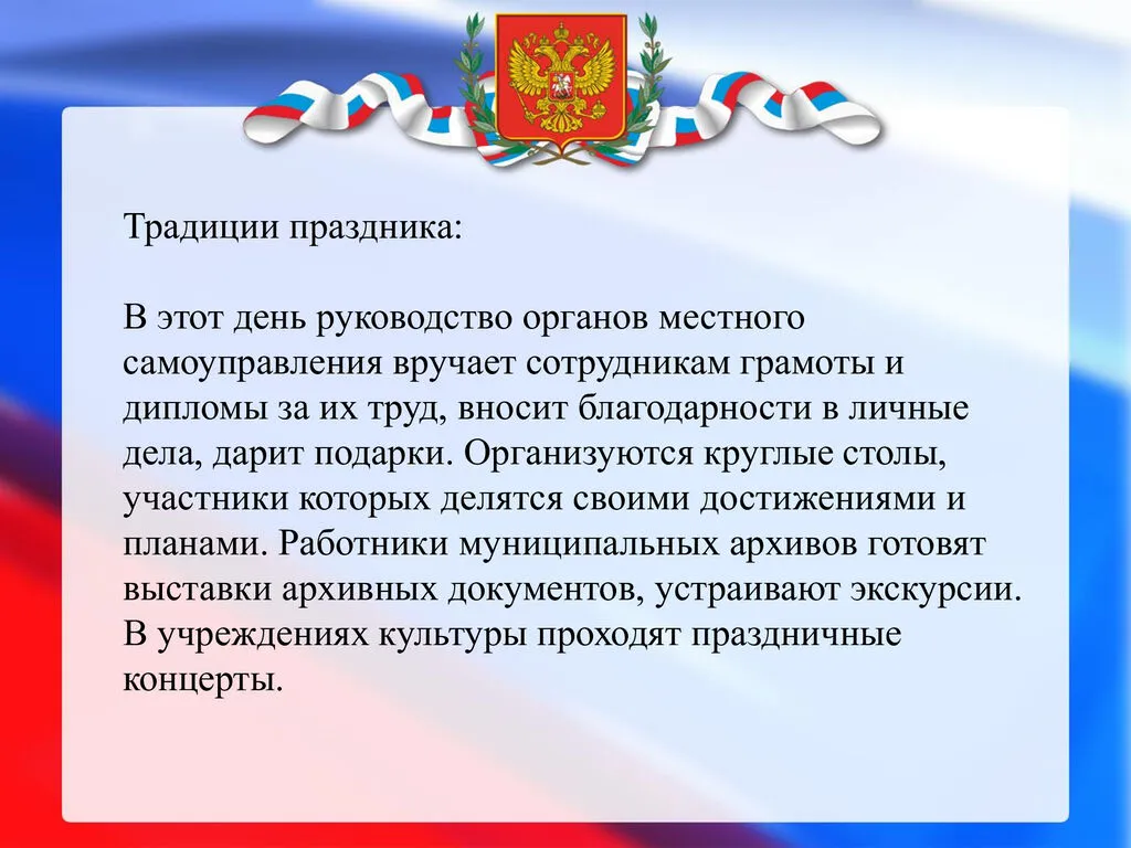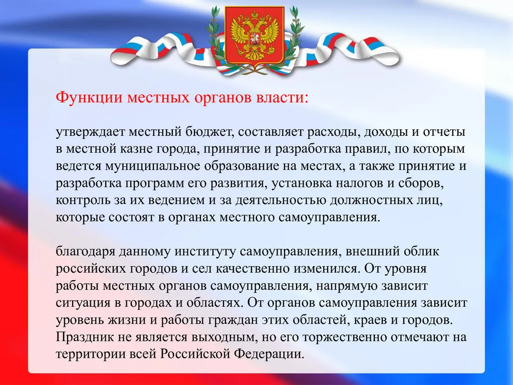 21 апреля в России отмечается День местного самоуправления — профессиональный праздник сотрудников муниципалитетов. Он был учреждён Указом Президента РФ № 805 от 10 июня 2012 года «в целях повышения роли и значения института местного самоуправления, развития демократии и гражданского общества».